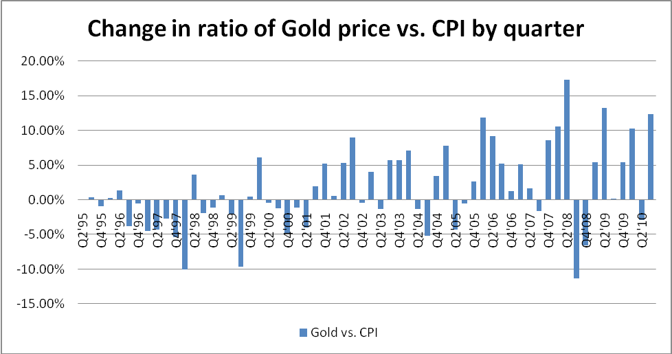 During the 1990’s, Gold prices did not even hold pace with the Consumer Price Index as market sentiment was tilted more toward stocks and the business sector. After the terrorist attacks of September 11th, gold regained some of its prominence, but it was the financial crisis of 2008 that brought Gold into the forefront. Over the last few years, gold prices have appreciated significantly faster than the CPI. This reflects a market sentiment that is anticipating large amounts of future inflation, and is seeking Gold as a place to hold value when paper currencies de-value.