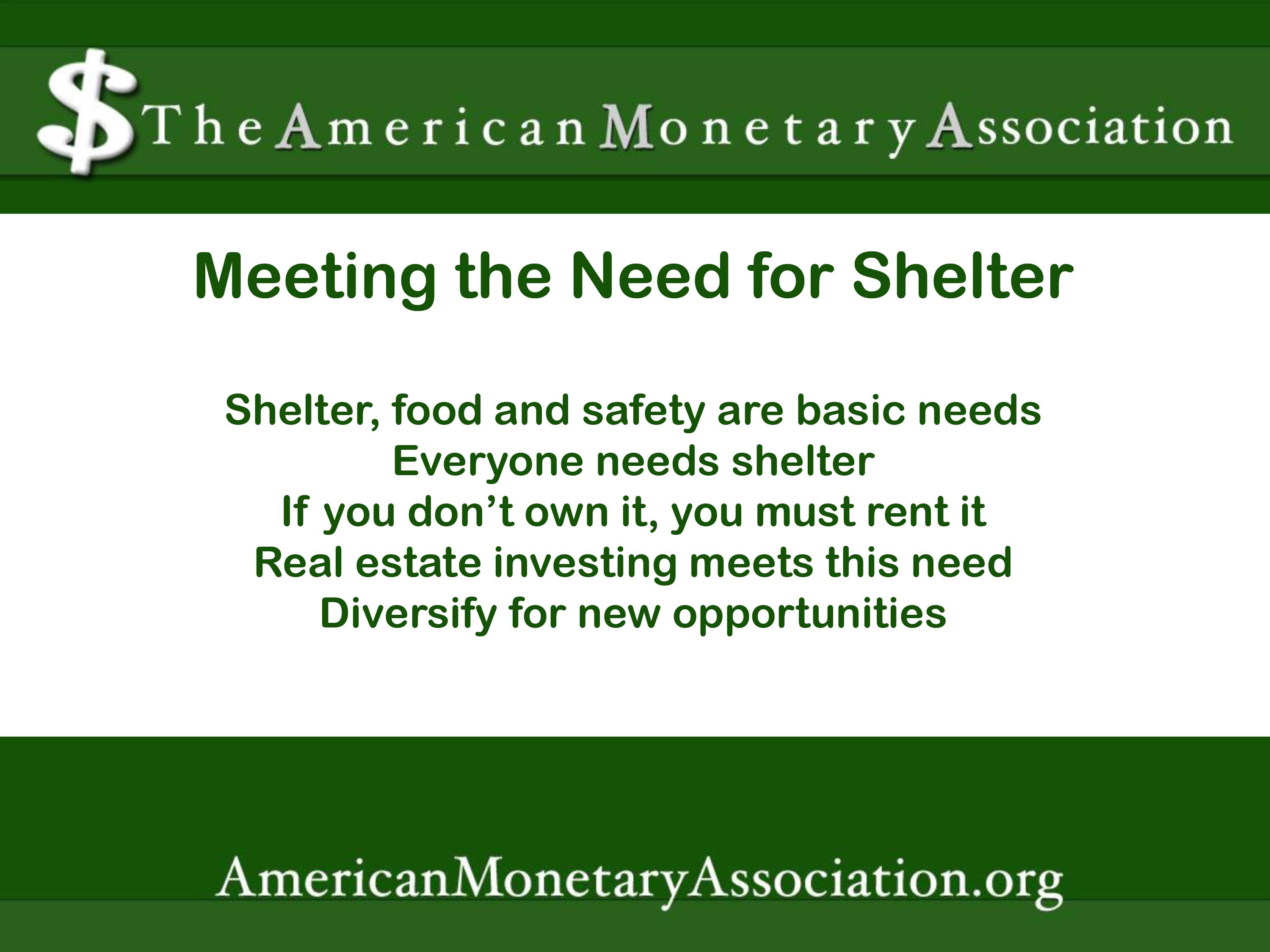 As Maslow observed in the early 1940s, shelter is a basic need of the human creature – one which, for most people, must be met before many others, The need for safe shelter is pre-eminent among the majority of people in the United States and similar countries, and those who can’t purchase shelter must rent it. Opportunities to provide that shelter can exist in any area, if investors and their advisors follow Jason Hartman’s recommendation to remain area agnostics, open to all possibilities for good investments in many different locations.